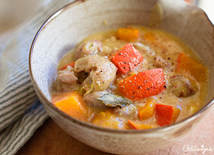 La base de cette recette reste la même que la blanquette classique de mémé Simone. Ce qui rafraichit un peu l’ensemble concerne plus la garniture : du potimarron et des marrons à la place des carottes et des champignons. Coup de bol, j’avais encore des châtaignes au congélateur ! Les étoiles étaient alignées, il n’y avait plus qu’à tester.