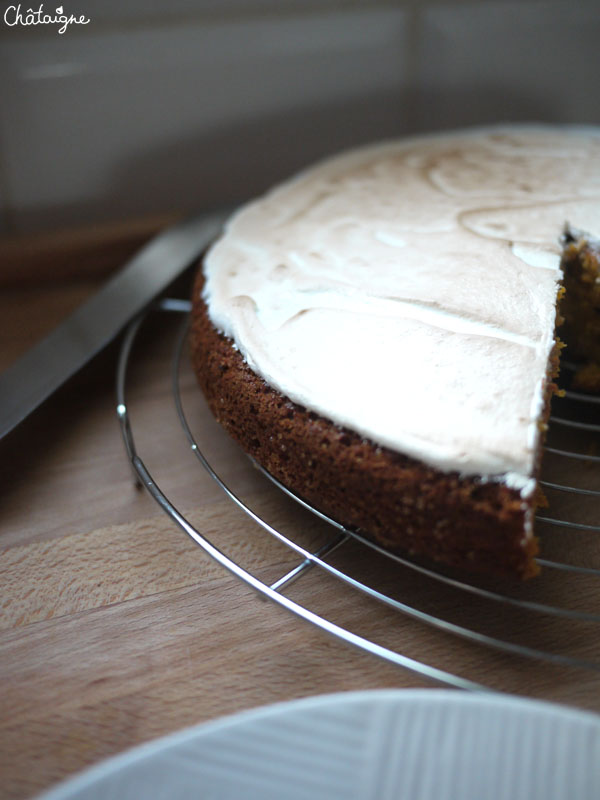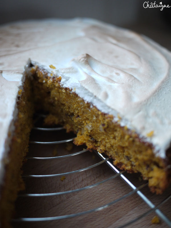 Tu comprends donc que je me devais de tester la carotte dans un dessert. M. Rabat-Joie n’était pas vraiment emballé mais je suis passée outre sa moue sceptique ! Le résultat était top. D’après le magazine, le gâteau est encore meilleur le lendemain (et c’est bien vrai !). Pour l’instant il est pile ce que j’aime : un gâteau dépaysant mais très gourmand. Pour ceux qui auraient peur de la carotte, n’ayez aucune crainte on n’en retrouve pas le goût, seulement sa belle couleur. Le topping en meringue apportait encore plus de gourmandise. Cela dit, le gâteau se suffit à lui-même, je pense que la prochaine fois je ne mettrais rien dessus ;)