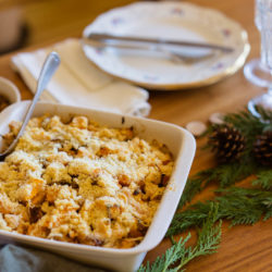 Depuis le début de l’automne, nous avons mangé des kilos de courge butternut –la meilleure selon moi ^^ Il était donc tout normal de la retrouver dans ces idées de plats de fêtes avec ce Crumble de butternut et châtaignes.Alors oui, les puristes attendront probablement le traditionnel gratin dauphinois pour accompagner la dinde ou le chapon. Mais comme il y a des châtaignes on peut presque considérer ce Crumble de butternut comme un « classique » non ?! (je te préviens, les deux prochaines recettes seront aussi à base de châtaignes, on ne m’arrête plus cette année, mouahaha !).