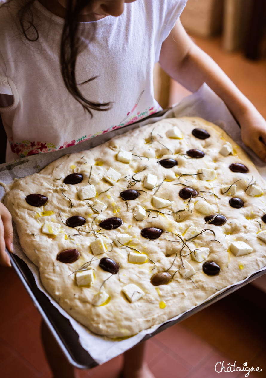 Focaccia aux olives noires et à la feta