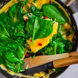 On a donc attendu le meilleur moment pour s’assurer une belle cueillette, mais tu connais les épinards : même si tu as un gros volume au départ, après cuisson il ne reste plus rien ! J’aurais pu opter pour des galettes de maïs aux épinards, mais j’ai préféré tester cette frittata qui n’est rien d’autre qu’une omelette avec des trucs dedans (la frittata c’est italien, c’est une omelette garnie de différents ingrédients).