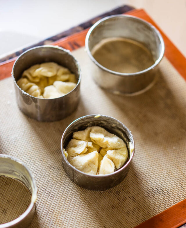 - Placer les kouign amann dans un cercle de 8cm de diamètre (ici plutôt 6cm). Et les mettre sur une plaque recouverte de papier cuisson.
