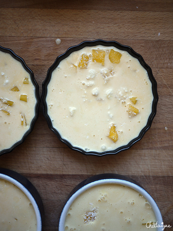 1. Préparer la mangue. Éplucher la mangue et la découper en petits cubes de 5 mm environ. Les déposer dans 4 ramequins à crème brûlée. Saupoudrer de noix de coco râpée.