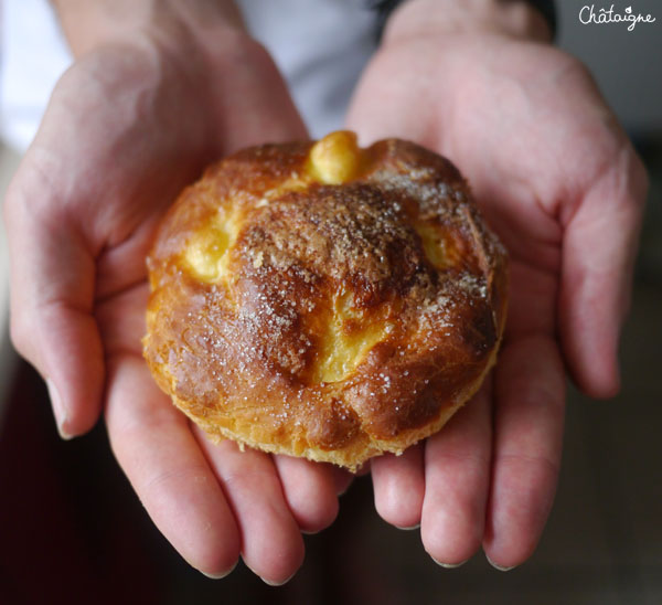J’avais déjà essayé cette petite viennoiserie mais sans être convaincue, un peu trop sec, trop fin, pas comme dans les boulangeries. Et moi, tu me connais, tant que je n’ai pas trouvé la bonne recette, je ré-essaie ! Mais là, j’ai senti que c’était la bonne, une pâte qui lève pour former un cœur moelleux, un dessus sucré et doré : dans le mille ! A un détail près d’après M. Rabat-Joie, il aurait fallu beaucoup plus de sucre !