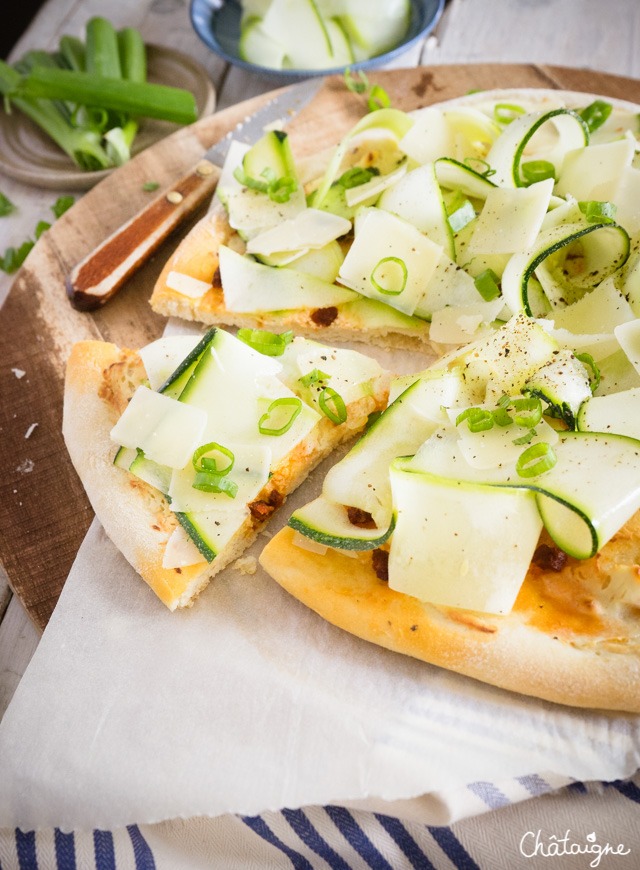 - A la sortie du four, déposer les courgettes sur les pizzas, les copeaux de parmesan et de l’oignon cébette. Arroser d’un filet d’huile d’olive, et terminer par un peu de poivre du moulin.
