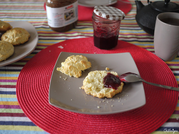 Bref, c’est la mort dans l’âme, que demain il faut retourner au boulot … Et pour ensoleiller cette dernière journée de « je-fais-ce-que-je-veux », un bon goûter comme on les aime (qui fait aussi très bon petit-déjeuner) ! Ça fait un petit moment que j’avais envie de goûter aux scones, ces petits pains ronds d’origine britannique.