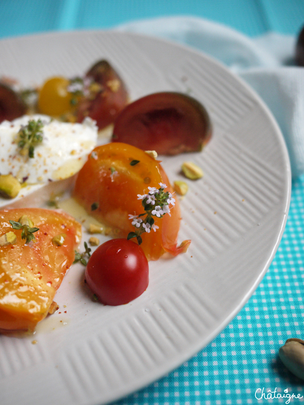 Révisons nos classiques : Tomates-Mozzarella {thym et pistache}