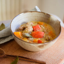 Ajouter le potimarron en cubes et poursuivre la cuisson 15 minutes sur feu moyen, mi-couvert (mettre un couvercle à moitié sur la cocotte).