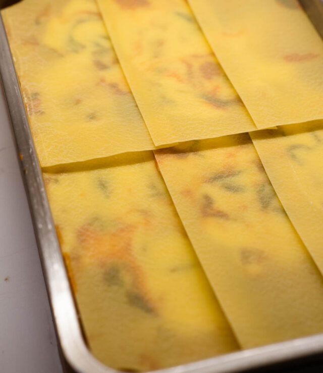 Répéter l’opération : le reste des blettes à la tomate, le 2eme tiers de béchamel et les pâtes à lasagnes. Enfin, terminer avec le reste de béchamel et recouvrir d’emmental râpé.